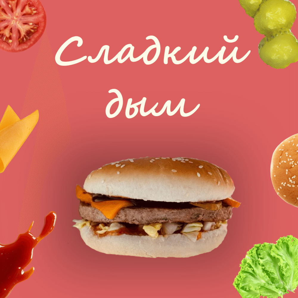 Булочка с кунжутом, говяжья котлета, соус сладкий барбекю, салат Айсберг, маринованный огурец, свежий помидор, сыр Чеддер